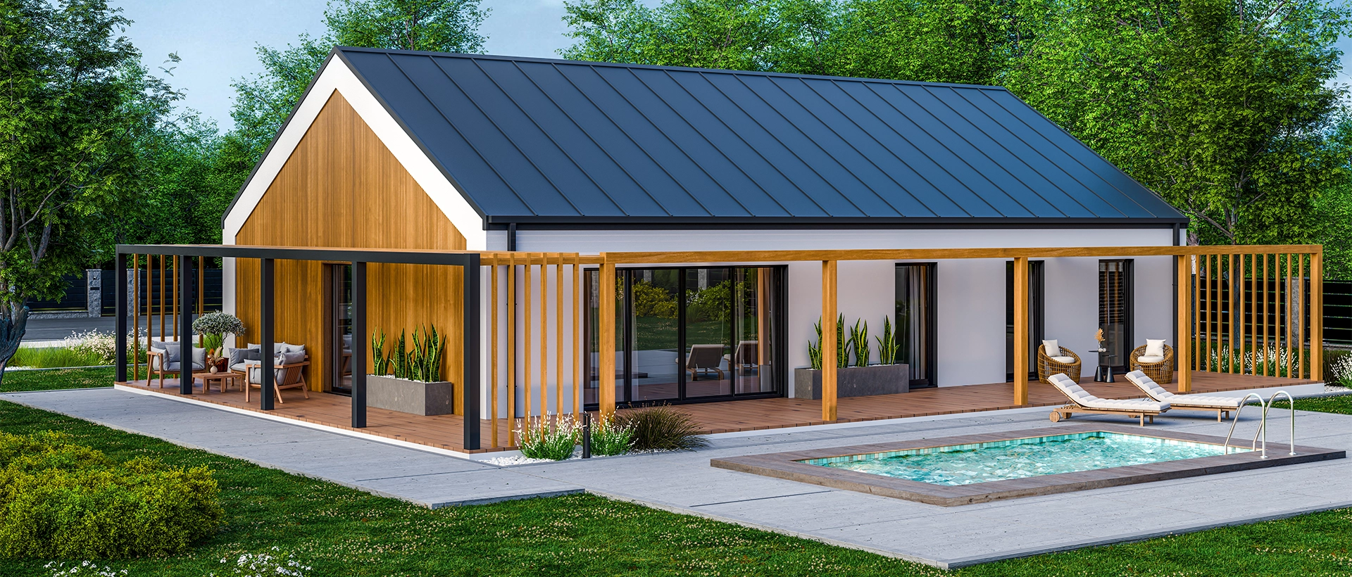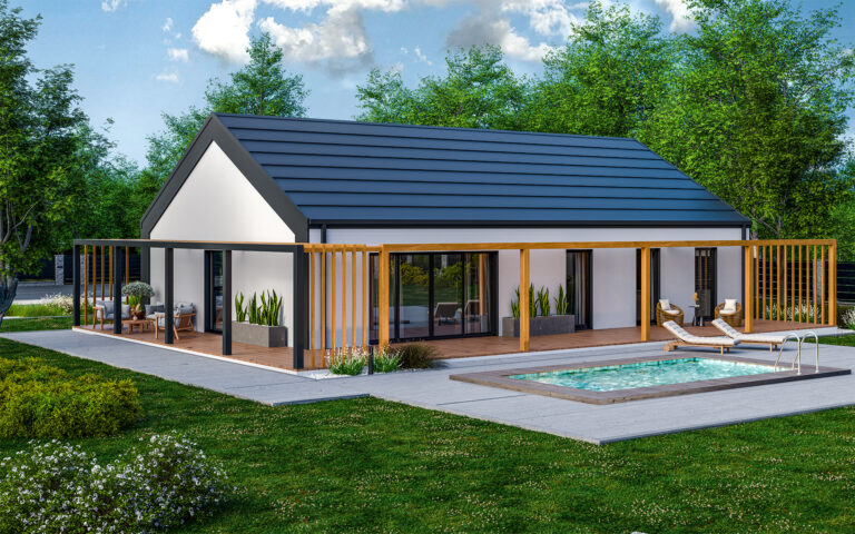 Parterowy dom o powierzchni 134,19 m² to propozycja dla osób, które marzą o naprawdę przestronnym wnętrzu. Imponujący metraż pozwala na swobodny podział na strefy: dzienną, prywatną i techniczną, a przemyślany układ pomieszczeń zapewnia wygodę całej rodzinie. Dom, który daje miejsce na wszystko, co ważne. Obszerny salon z jadalnią, półotwartą kuchnię, cztery sypialnie, dwie łazienki oraz dodatkowe pomieszczenia gospodarcze. Dzięki lekkiej technologii szkieletowej powstaje szybciej niż tradycyjne budynki i może być idealnie dopasowany do Twoich potrzeb.